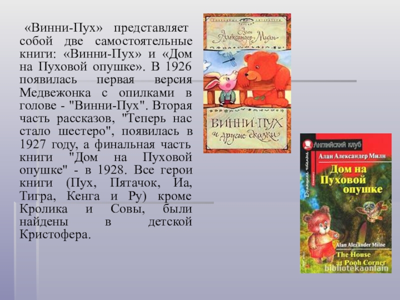 Слайд 11 «Винни-Пух» представляет собой две самостоятельные книги: «Винни-Пух» и «Дом на