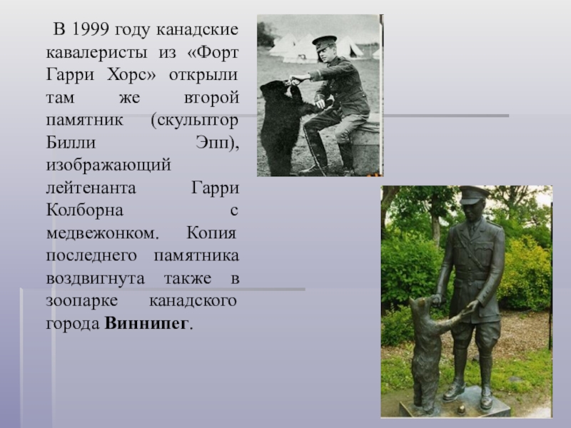Хорс» открыли там же второй памятник (скульптор Билли Эпп), изображающий лейтенанта Гарри Колборна с медвежонком. Копия последнего памятника воздвигнута также в зоопарке канадского города Виннипег.