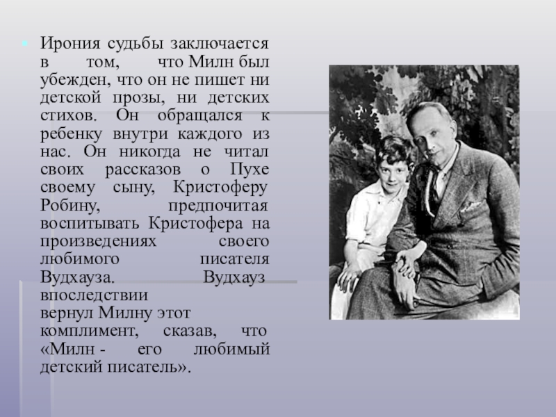 ни детской прозы, ни детских стихов. Он обращался к ребенку внутри каждого из нас. Он никогда не читал своих рассказов о Пухе своему сыну, Кристоферу Робину, предпочитая воспитывать Кристофера на произведениях своего любимого писателя Вудхауза. Вудхауз впоследствии вернул Милну этот комплимент, сказав, что «Милн - его любимый детский писатель».
