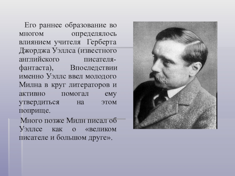 Герберта Джорджа Уэллса (известного английского писателя-фантаста), Впоследствии именно Уэллс ввел молодого Милна в круг литераторов и активно помогал ему утвердиться на этом поприще.