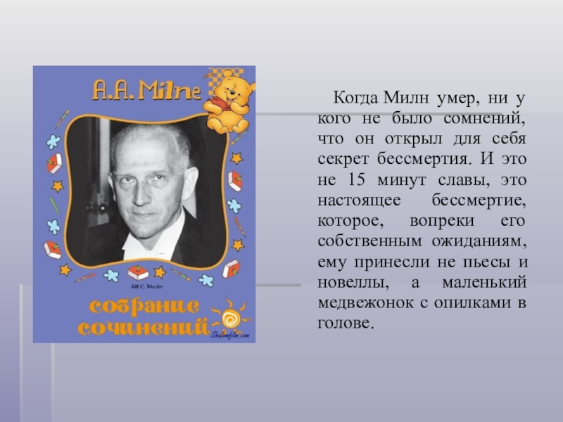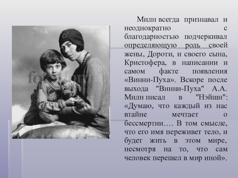 роль своей жены, Дороти, и своего сына, Кристофера, в написании и самом факте появления «Винни-Пуха». Вскоре после выхода "Винни-Пуха" А.А. Милн писал в "Нэйшн": «Думаю, что каждый из нас втайне мечтает о бессмертии…. В том смысле, что его имя переживет тело, и будет жить в этом мире, несмотря на то, что сам человек перешел в мир иной».