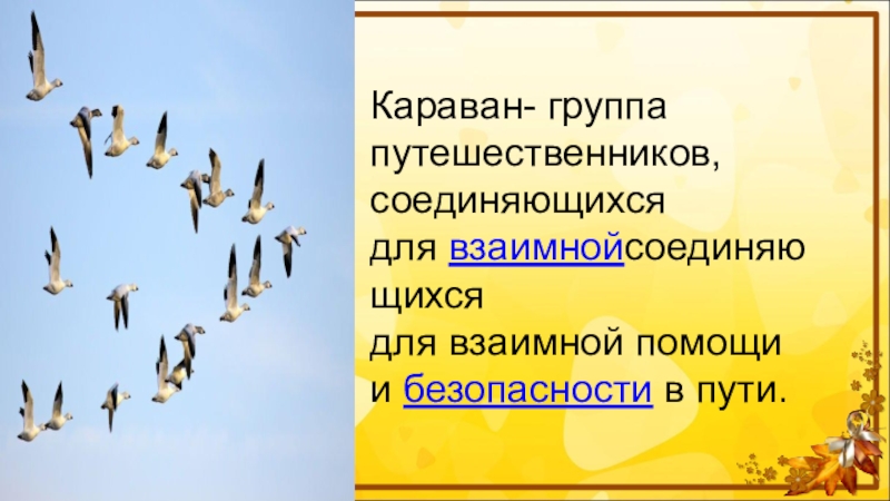 Караван- группа путешественников, соединяющихся для взаимнойсоединяющихся для взаимной помощи и безопасности в пути.
