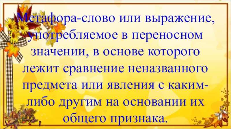 Метафора-слово или выражение, употребляемое в переносном значении, в основе которого лежит сравнение неназванного предмета или явления с