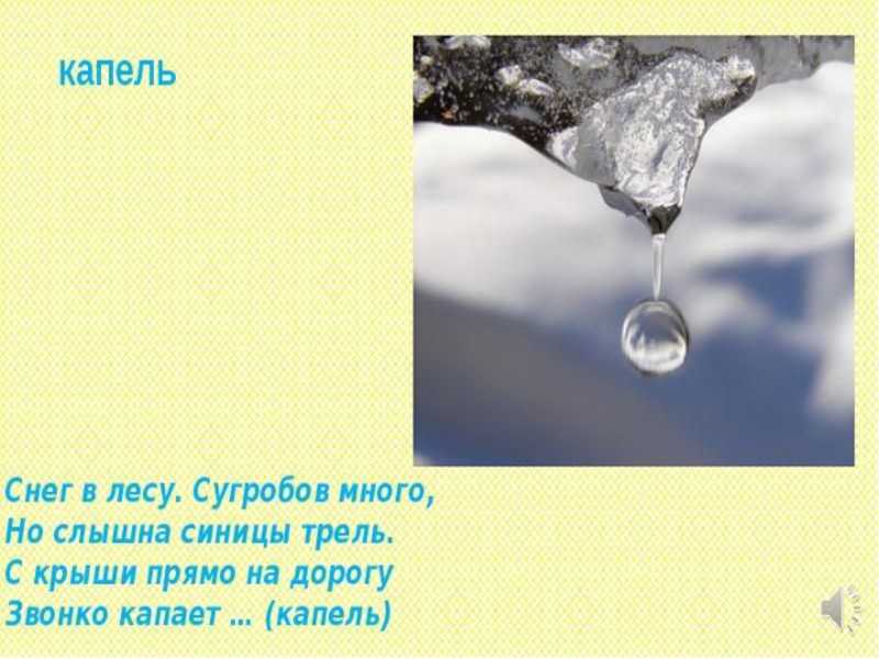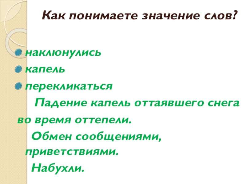 Как понимаете значение слов? наклюнулиськапельперекликаться   Падение капель оттаявшего снега во время оттепели.  Обмен сообщениями,