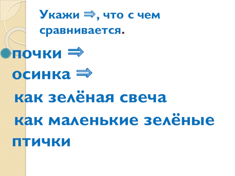 Укажи ⇒, что с чем сравнивается.почки ⇒      осинка ⇒  как зелёная свеча  как