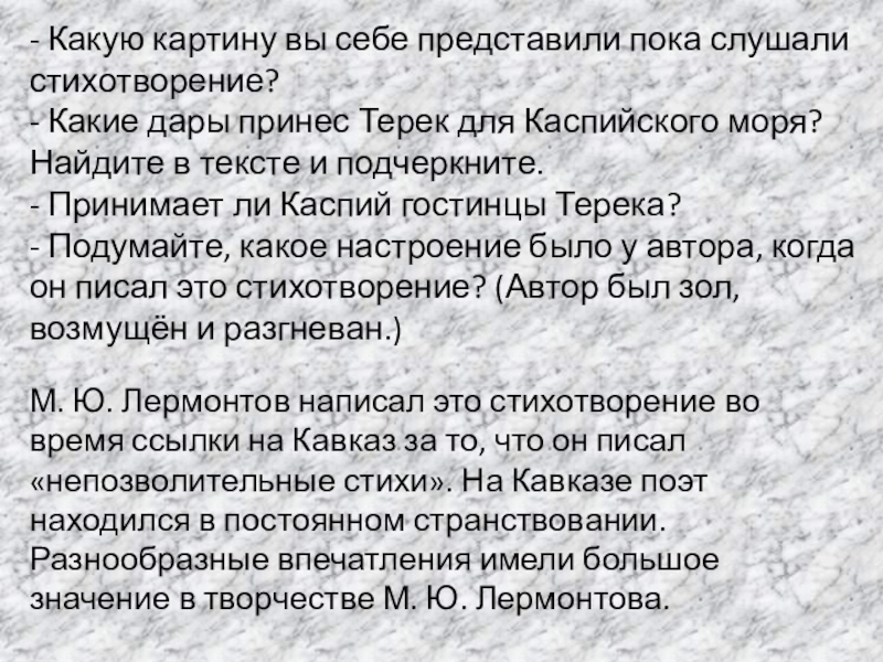 - Что необычного в изображении Терека? Как меняется образ в произведении? (Когда Терек несётся к морю он воет и злится. В разговоре с Каспием он стихает, как будто боится его, пресмыкается перед ним.)