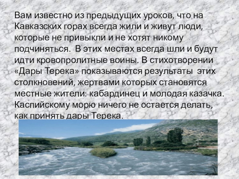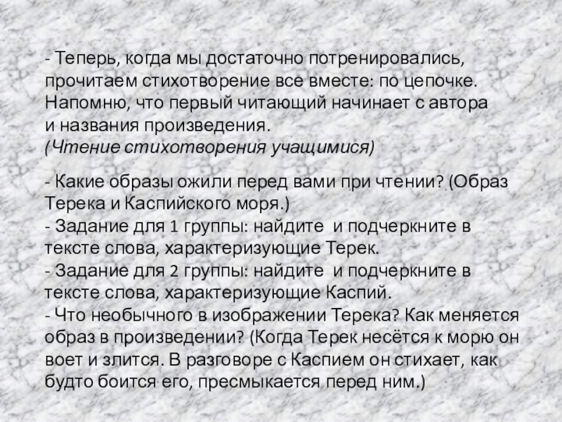 - Какие образы ожили перед вами при чтении? (Образ Терека и Каспийского моря.)