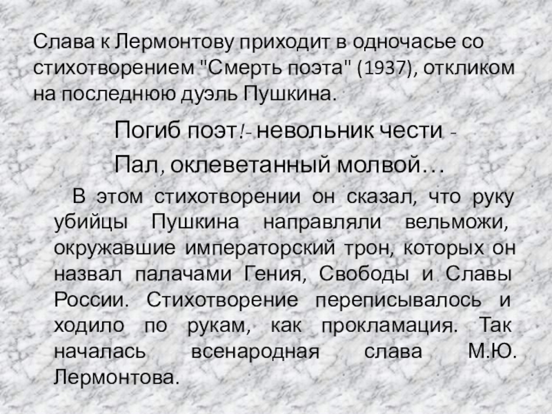В этом стихотворении он сказал, что руку убийцы Пушкина направляли вельможи, окружавшие императорский трон, которых он назвал палачами Гения, Свободы и Славы России. Стихотворение переписывалось и ходило по рукам, как прокламация. Так началась всенародная слава М.Ю.Лермонтова.