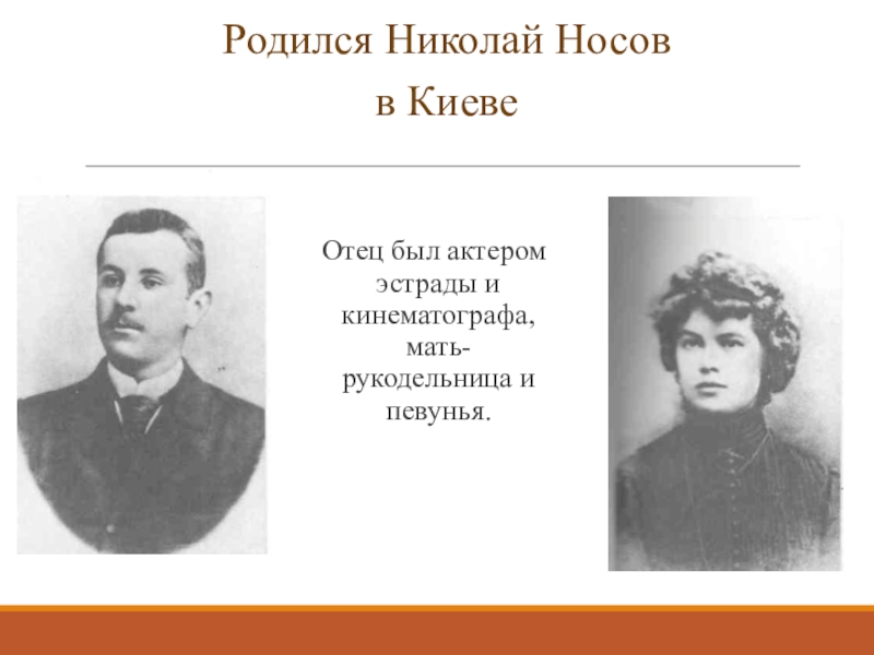 Отец был актером эстрады и кинематографа, мать-рукодельница и певунья.Родился Николай Носовв Киеве