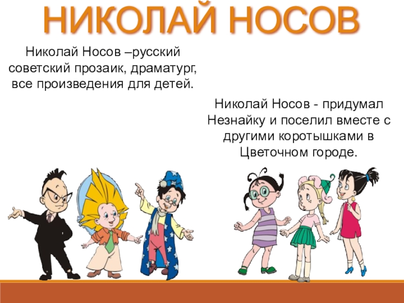 НИКОЛАЙ НОСОВНиколай Носов –русский советский прозаик, драматург, все произведения для детей.Николай Носов - придумал Незнайку и поселил вместе с другими коротышками в Цветочном городе.