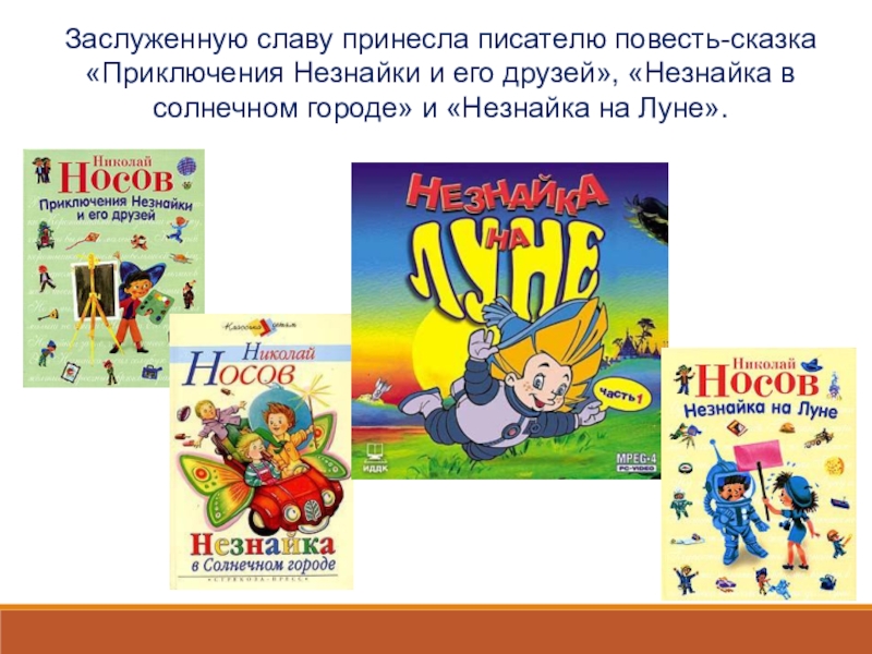 Заслуженную славу принесла писателю повесть-сказка «Приключения Незнайки и его друзей», «Незнайка в солнечном городе» и «Незнайка на