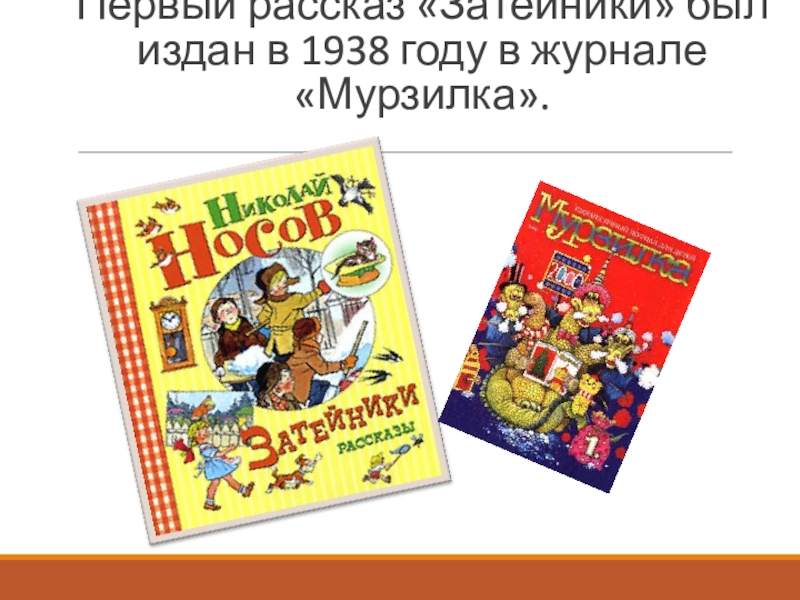Слайд 8Первый рассказ «Затейники» был издан в 1938 году в журнале «Мурзилка».