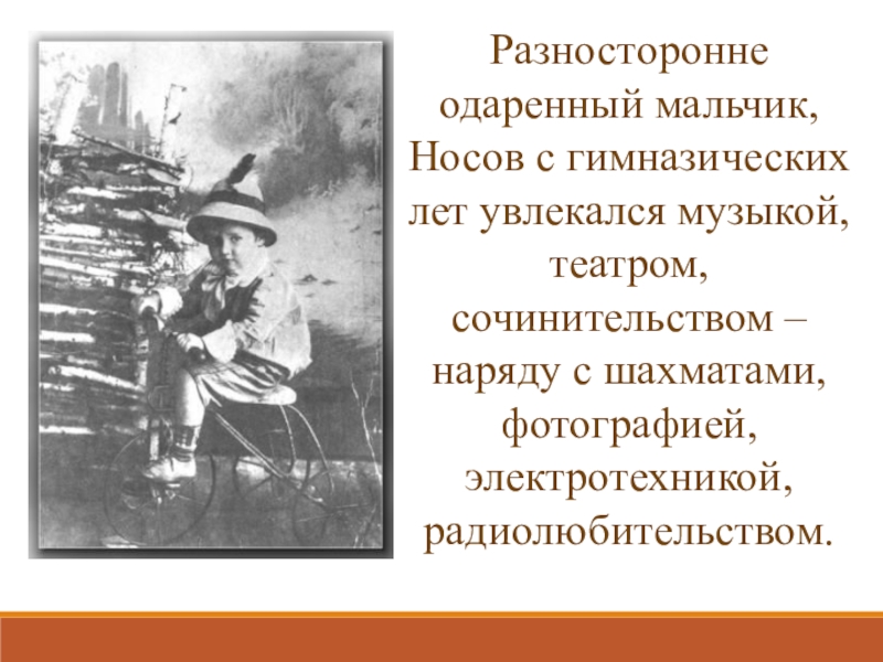 Разносторонне одаренный мальчик, Носов с гимназических лет увлекался музыкой, театром, сочинительством – наряду с шахматами, фотографией, электротехникой,