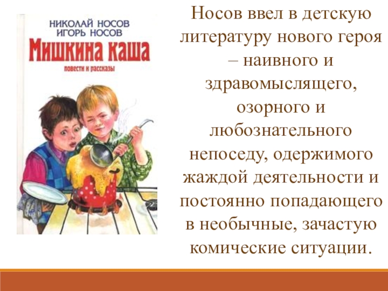 Слайд 9Носов ввел в детскую литературу нового героя – наивного и здравомыслящего,