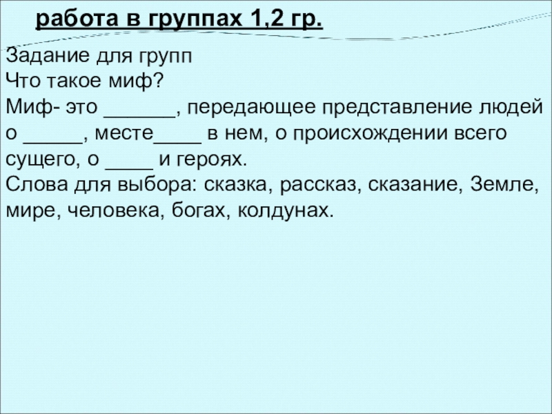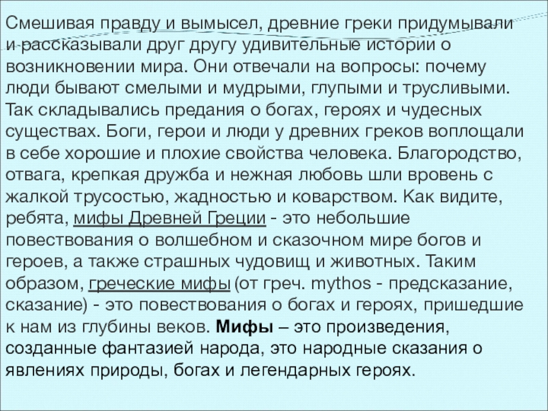 удивительные истории о возникновении мира. Они отвечали на вопросы: почему люди бывают смелыми и мудрыми, глупыми и трусливыми. Так складывались предания о богах, героях и чудесных существах. Боги, герои и люди у древних греков воплощали в себе хорошие и плохие свойства человека. Благородство, отвага, крепкая дружба и нежная любовь шли вровень с жалкой трусостью, жадностью и коварством. Как видите, ребята, мифы Древней Греции - это небольшие повествования о волшебном и сказочном мире богов и героев, а также страшных чудовищ и животных. Таким образом, греческие мифы (от греч. mythos - предсказание, сказание) - это повествования о богах и героях, пришедшие к нам из глубины веков. Мифы – это произведения, созданные фантазией народа, это народные сказания о явлениях природы, богах и легендарных героях.