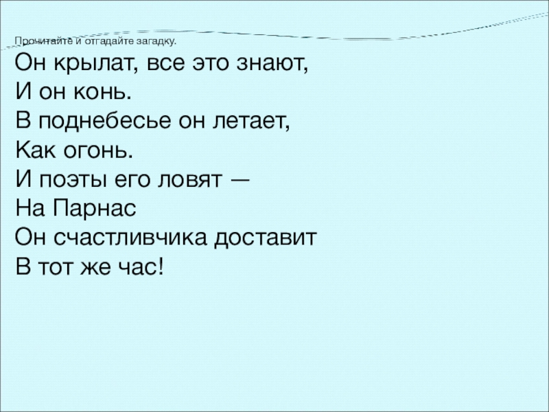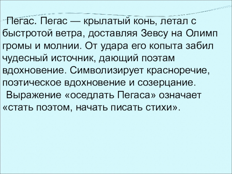 на Олимп громы и молнии. От удара его копыта забил чудесный источник, дающий поэтам вдохновение. Символизирует красноречие, поэтическое вдохновение и созерцание.