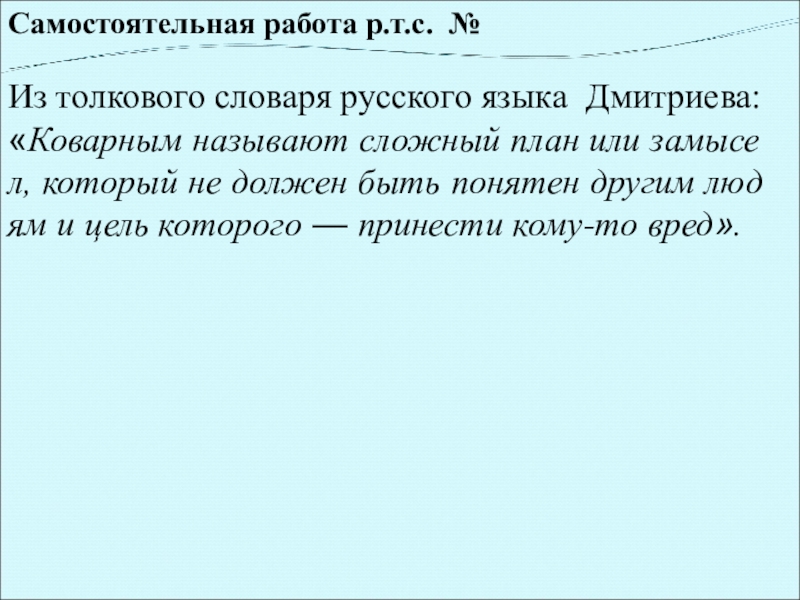 «Коварным называют сложный план или замысел, который не должен быть понятен другим людям и цель которого — принести кому-то вред».