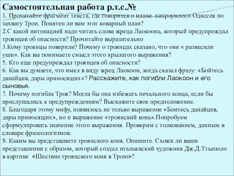2.С какой интонацией надо читать слова жреца Лаокоона, который предупреждал троянцев об опасности? Прочитайте выразительно