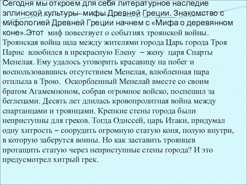 Греции. Знакомство с мифологией Древней Греции начнем с «Мифа о деревянном коне».Этот миф повествует о событиях троянской войны. Троянская война шла между жителями города Царь города Троя Парис влюбился в прекрасную Елену – жену царя Спарты Менелая. Ему удалось уговорить красавицу на побег и воспользовавшись отсутствием Менелая, влюбленная пара отплыла в Трою. Оскорбленный Менелай вместе со своим братом Агамемноном, собрав огромное войско, поспешил за беглецами. Десять лет длилась кровопролитная война между спартанцами и троянцами. Крепкие стены города были неприступны для греков. Тогда Одиссей, царь Итаки, придумал одну хитрость – соорудить огромную статую коня, полую внутри, в которую заберутся воины. Но как заставить троянцев протащить статую через неприступные стены города? И это предусмотрел хитрый грек.