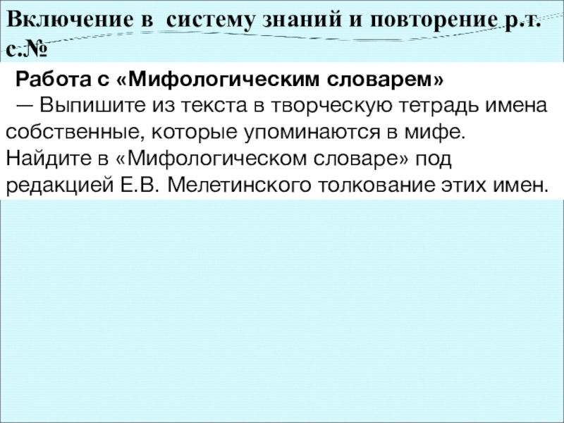— Выпишите из текста в творческую тетрадь имена собственные, которые упоминаются в мифе. Найдите в «Мифологическом словаре» под редакцией Е.В. Мелетинского толкование этих имен.