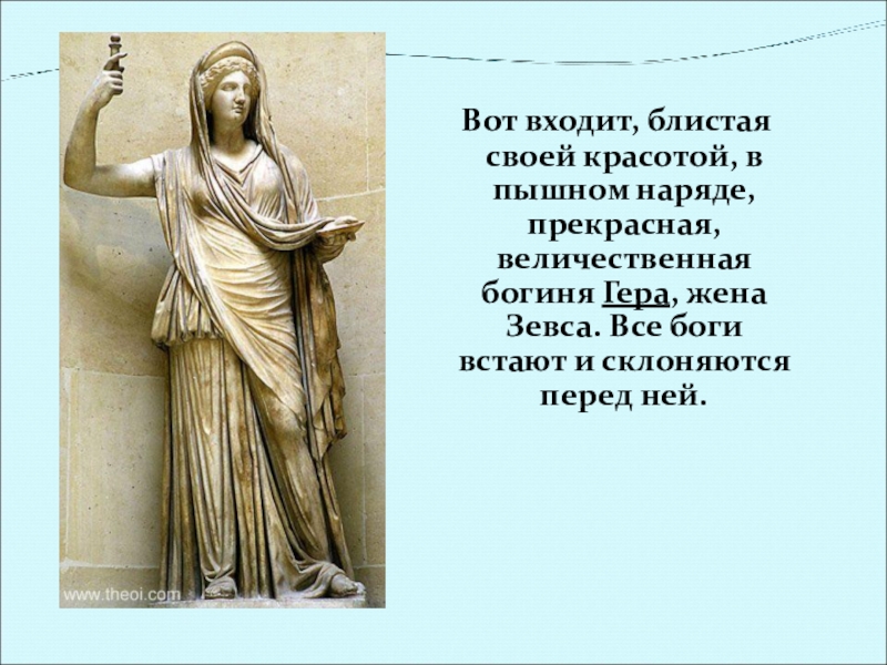прекрасная, величественная богиня Гера, жена Зевса. Все боги встают и склоняются перед ней.