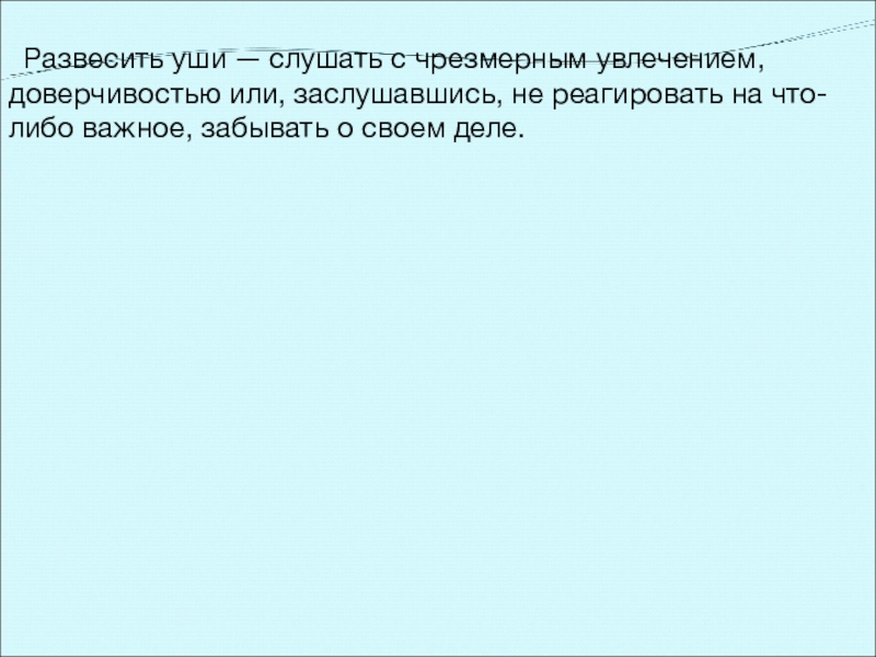 Развесить уши — слушать с чрезмерным увлечением, доверчивостью или, заслушавшись, не