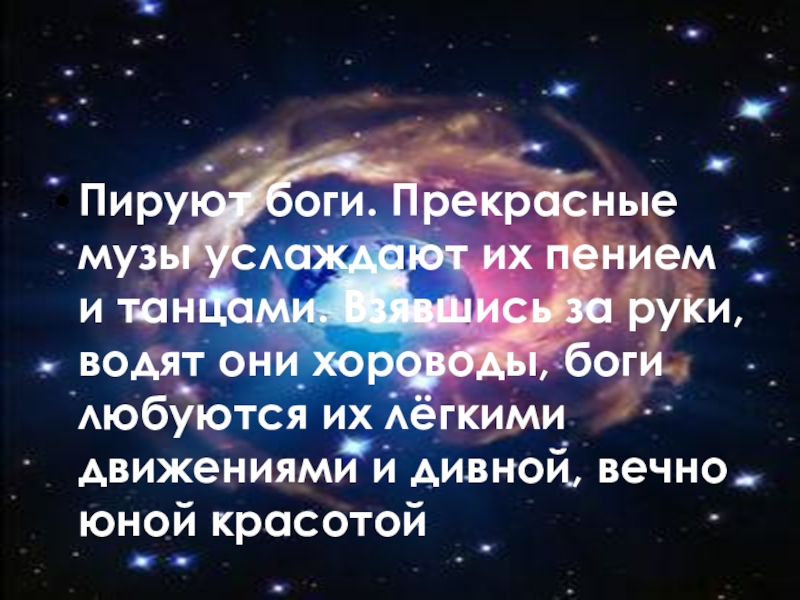 Слайд 24Пируют боги. Прекрасные музы услаждают их пением и танцами. Взявшись за