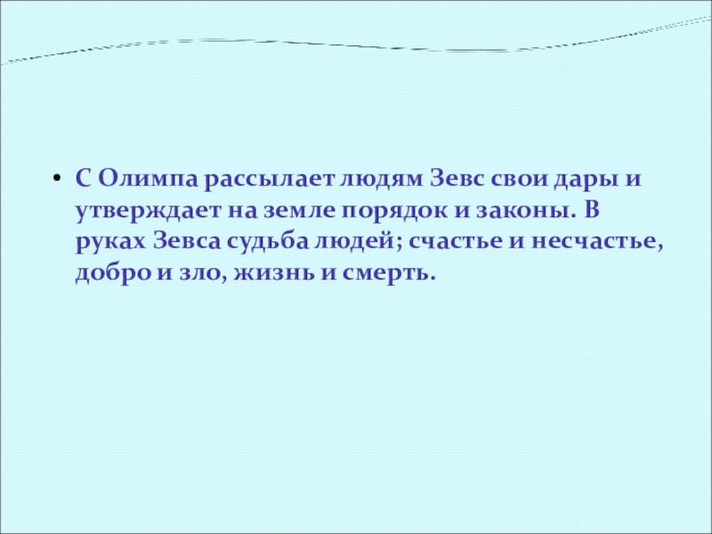 порядок и законы. В руках Зевса судьба людей; счастье и несчастье, добро и зло, жизнь и смерть.