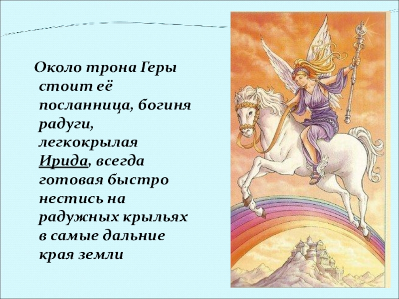 радуги, легкокрылая Ирида, всегда готовая быстро нестись на радужных крыльях в самые дальние края земли