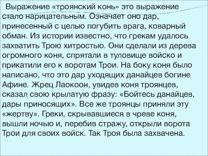 8. Благодаря этому мифу, появилось не только выражение «Боитесь данайцев, дары приносящих», но и выражение «троянский конь».Попробуем сформулировать значение этого выражения. Проверим с толкованием, данным в словаре фразеологизмов.