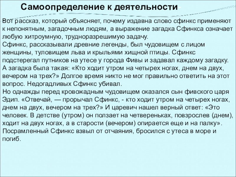 Сфинкс, рассказывали древние легенды, был чудовищем с лицом женщины, туловищем льва и крыльями хищной птицы. Сфинкс подстерегал путников на утесе у города Фивы и задавал каждому загадку.