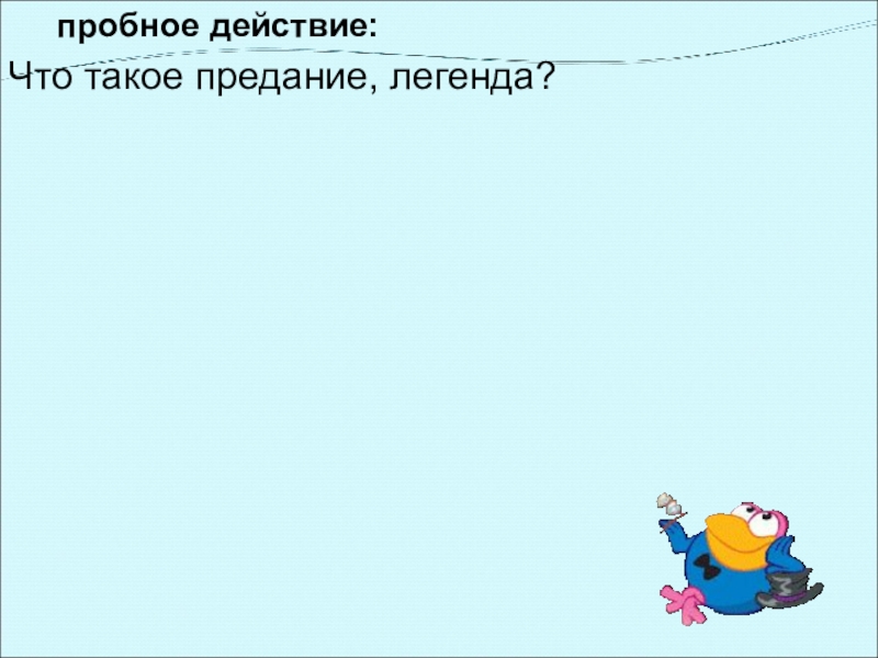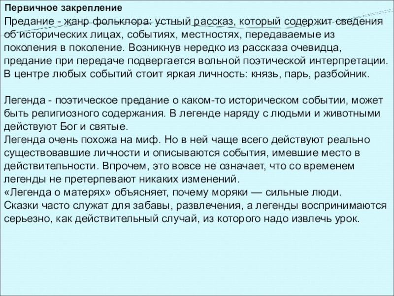 Легенда - поэтическое предание о каком-то историческом событии, может быть религиозного содержания. В легенде наряду с людьми и животными действуют Бог и святые.