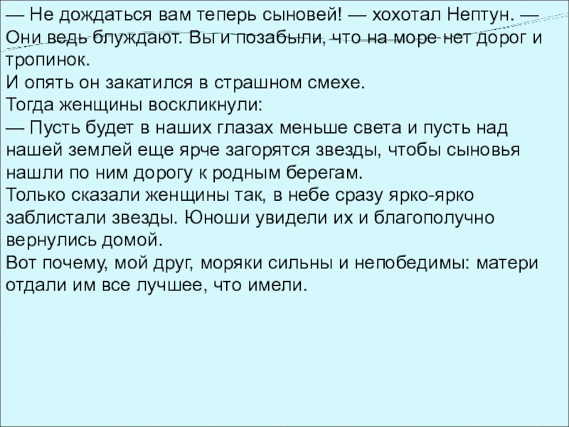 Появился опять перед женщинами Нептун и громко-громко засмеялся. От его смеха даже волны заходили по морю.