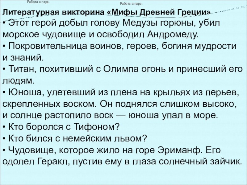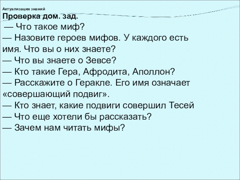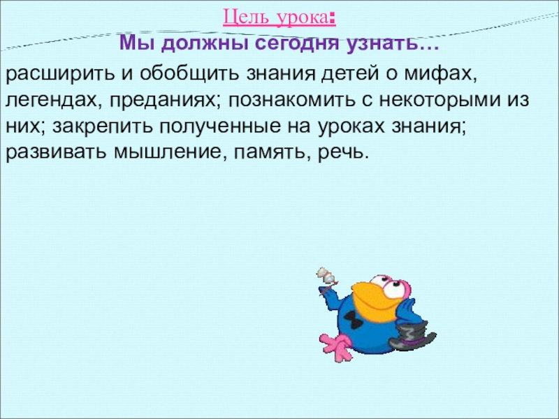 легендах, преданиях; познакомить с некоторыми из них; закрепить полученные на уроках знания; развивать мышление, память, речь.
