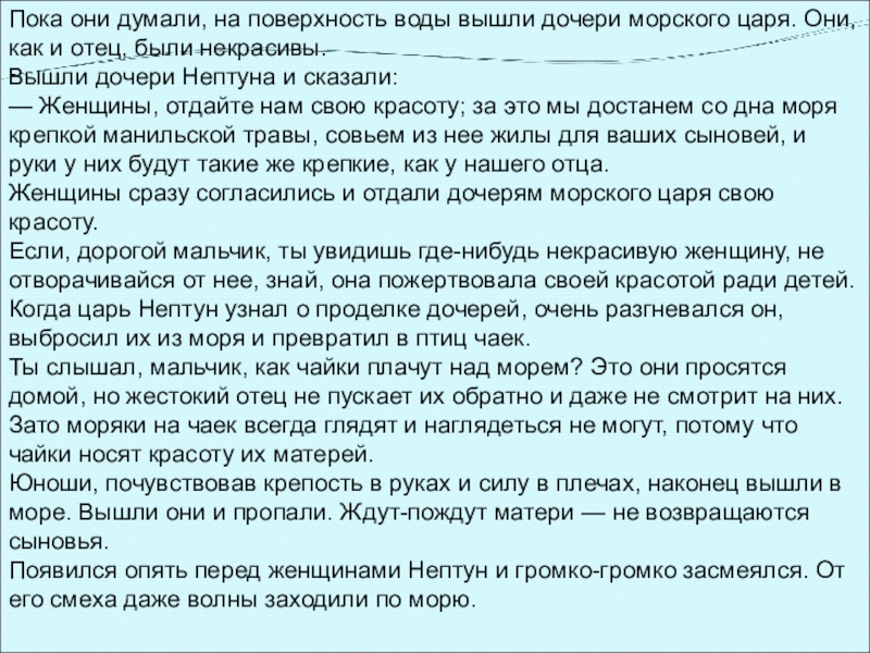 Женщины сразу согласились и отдали дочерям морского царя свою красоту.