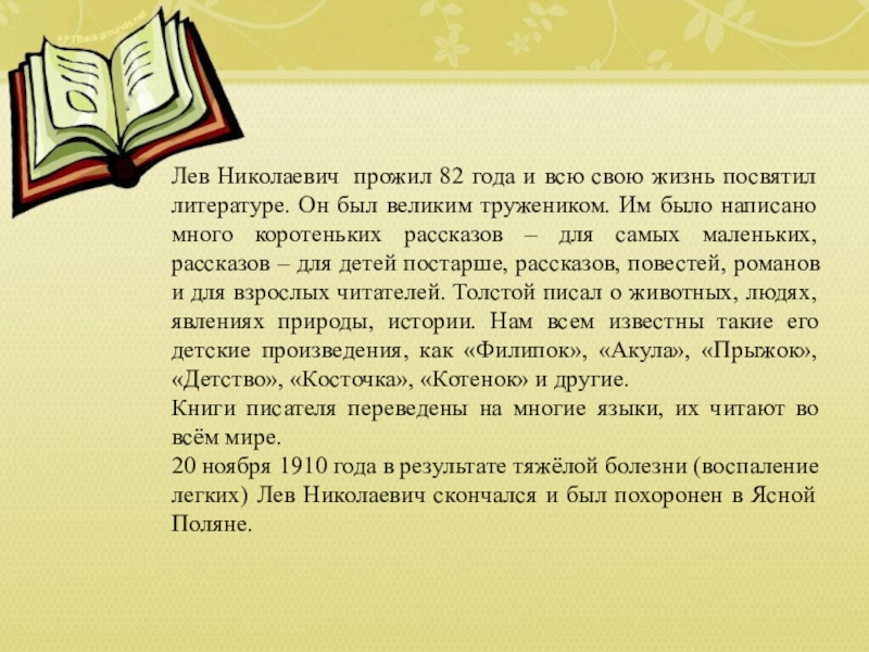Л. Н. Толстой очень любил детей и осенью в 1859 году открыл в своём имении Ясная Поляна школу для крестьянских детей. Тогда в нашей стране было очень мало школ даже в городах, а в деревнях почти все крестьяне были безграмотны. Толстой сам написал учебники «Азбуку» и «Новую Азбуку» и сам по ним учил крестьянских детей.