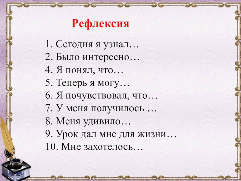 могу…  6. Я почувствовал, что…  7. У меня получилось …  8. Меня удивило…  9. Урок дал мне для жизни…  10. Мне захотелось…