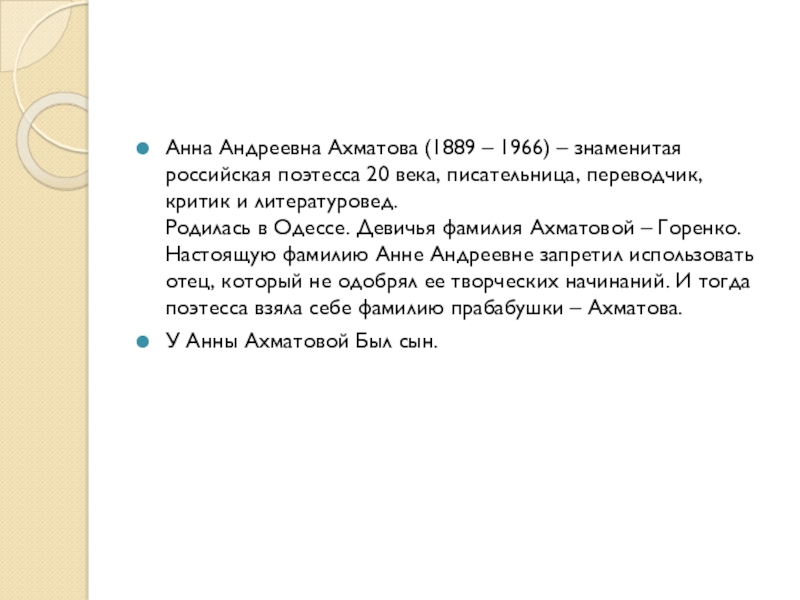Анна Андреевна Ахматова (1889 – 1966) – знаменитая российская поэтесса 20 века, писательница, переводчик, критик и литературовед. Родилась в Одессе. Девичья фамилия Ахматовой – Горенко. Настоящую фамилию Анне Андреевне запретил использовать отец, который не одобрял ее
