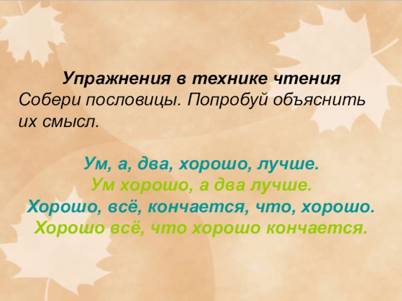Упражнения в технике чтения Собери пословицы. Попробуй объяснить их смысл.Ум, а, два, хорошо, лучше.Ум хорошо, а два лучше.Хорошо, всё, кончается, что, хорошо.Хорошо всё, что хорошо кончается.
