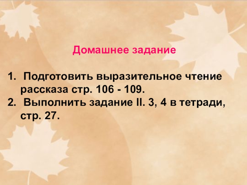 Домашнее задание Подготовить выразительное чтение рассказа стр. 106 - 109. Выполнить задание II. 3, 4 в