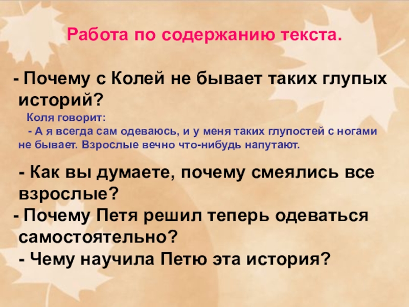 Работа по содержанию текста. Почему с Колей не бывает таких глупых историй?  Коля говорит: