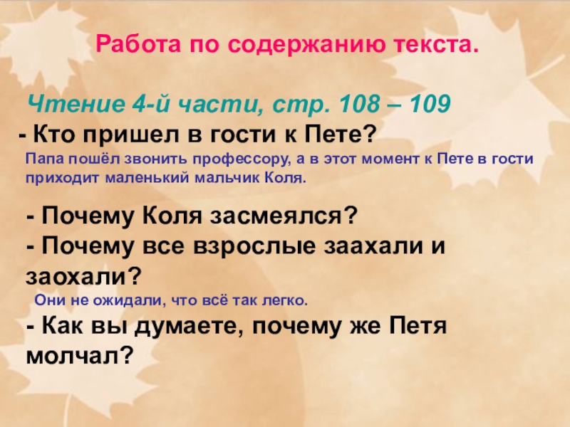 Работа по содержанию текста.Чтение 4-й части, стр. 108 – 109 Кто пришел в гости к Пете?Папа пошёл