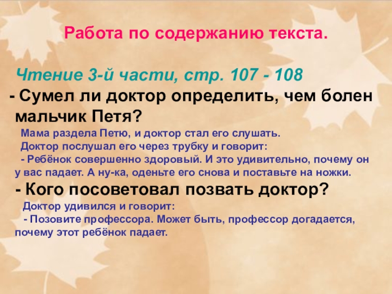 Работа по содержанию текста.Чтение 3-й части, стр. 107 - 108 Сумел ли доктор определить, чем болен мальчик