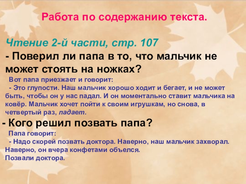 Работа по содержанию текста.Чтение 2-й части, стр. 107- Поверил ли папа в то, что мальчик не может