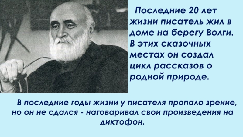 Последние 20 лет жизни писатель жил в доме на берегу Волги. В этих сказочных местах он создал цикл рассказов о родной природе.