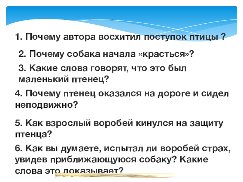 6. Как вы думаете, испытал ли воробей страх, увидев приближающуюся собаку? Какие слова это доказывает?