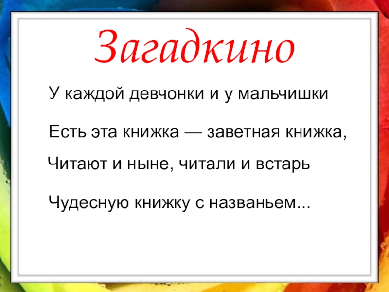 Загадкино У каждой девчонки и у мальчишки Есть эта книжка — заветная книжка, Читают и ныне, читали и встарь Чудесную книжку с названьем...