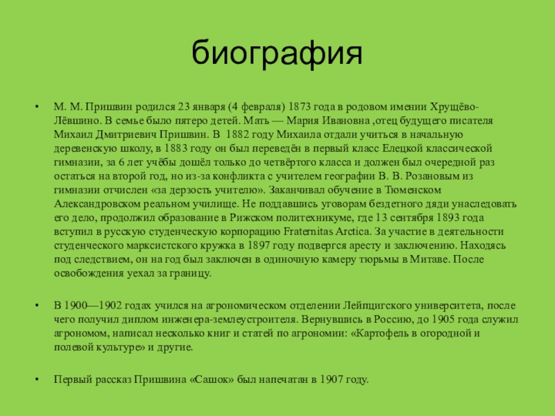биографияМ. М. Пришвин родился 23 января (4 февраля) 1873 года в родовом имении Хрущёво-Лёвшино. В семье было пятеро детей. Мать — Мария Ивановна ,отец будущего писателя Михаил Дмитриевич Пришвин. В 1882 году Михаила отдали учиться в начальную