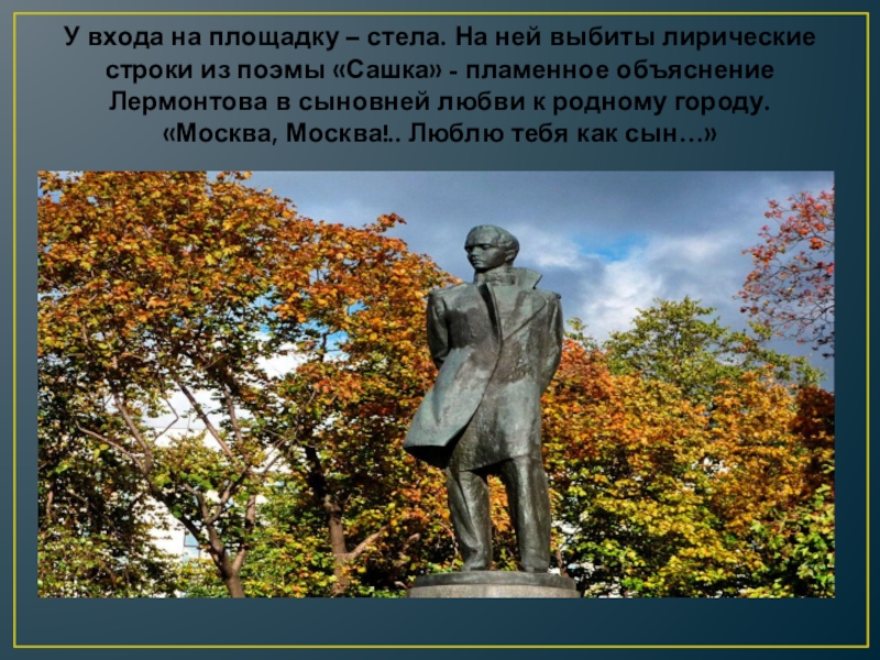 Слайд 18У входа на площадку – стела. На ней выбиты лирические строки