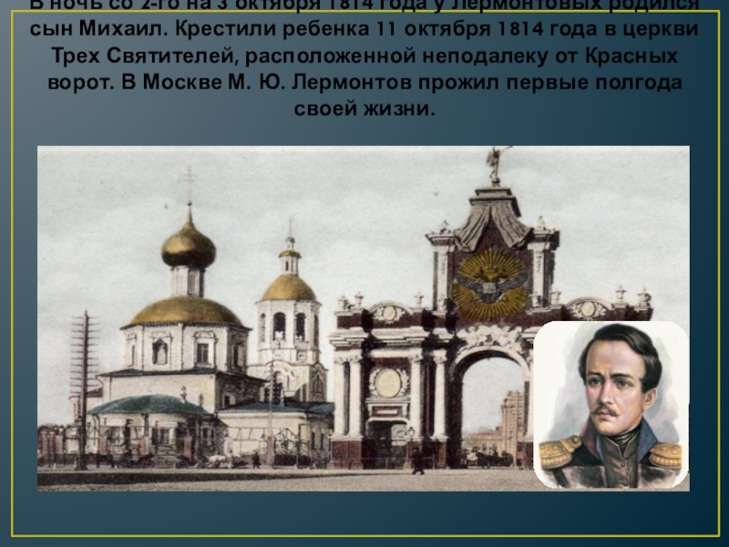 родился сын Михаил. Крестили ребенка 11 октября 1814 года в церкви Трех Святителей, расположенной неподалеку от Красных ворот. В Москве М. Ю. Лермонтов прожил первые полгода своей жизни.